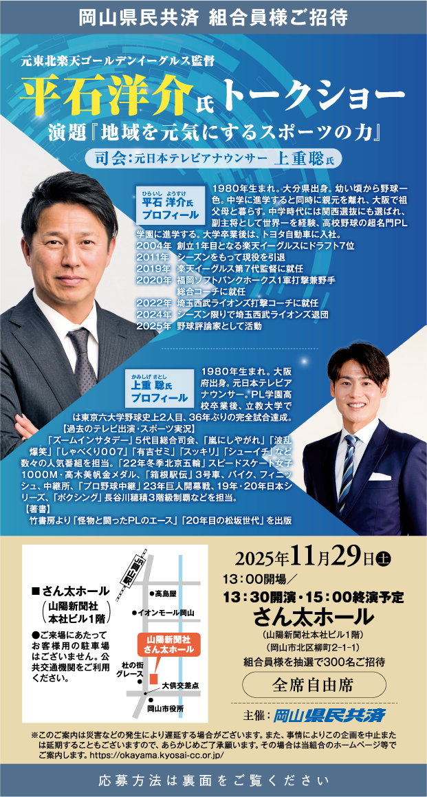 - 抽選結果については当選者の方のみメールでご案内いたします。迷惑メール対策設定状況によっては、メールが届かない場合があります。あらかじめ当該メール(ok.event@okayamakenminkyosai.or.jp)を受信できるよう受信リストに設定してください。