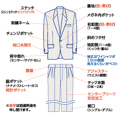 - 追加料金でダブルスーツやスリーピースもお仕立ていただけます。
